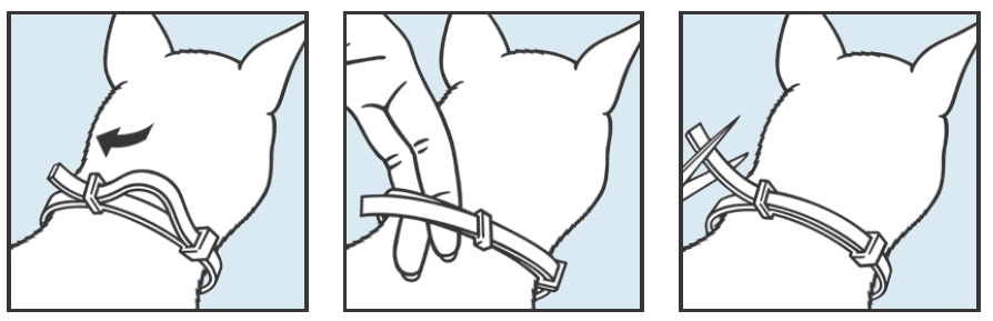 Remove the Seresto collar from the pouch. Remove any remaining plastic connectors on the inside of the collar. Put the collar around your cat’s neck and insert the loose end into the two loops. Cut off any extra collar length, leaving about 2 cm of the loose end beyond the second loop.
